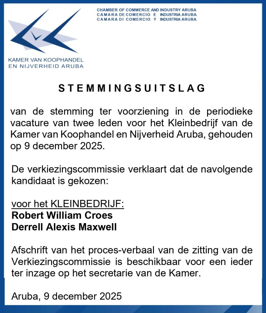 The election process is overseen by the Election Committee. The rules and requirements regarding the voters’ list, candidacy, and ballot casting are established in the Election Ordinance of the Aruba Chamber of Commerce – Kiesverordening Kamer van Koophandel en Nijverheid (AB 1993 no. GT37). See also the National Ordinance regarding the Aruba Chamber of Commerce – Landsverordening op de Kamer van Koophandel en Nijverheid.