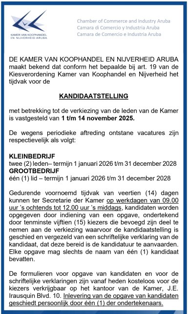 The election process is overseen by the Election Committee. The rules and requirements regarding the voters’ list, candidacy, and ballot casting are established in the Election Ordinance of the Aruba Chamber of Commerce – Kiesverordening Kamer van Koophandel en Nijverheid (AB 1993 no. GT37).